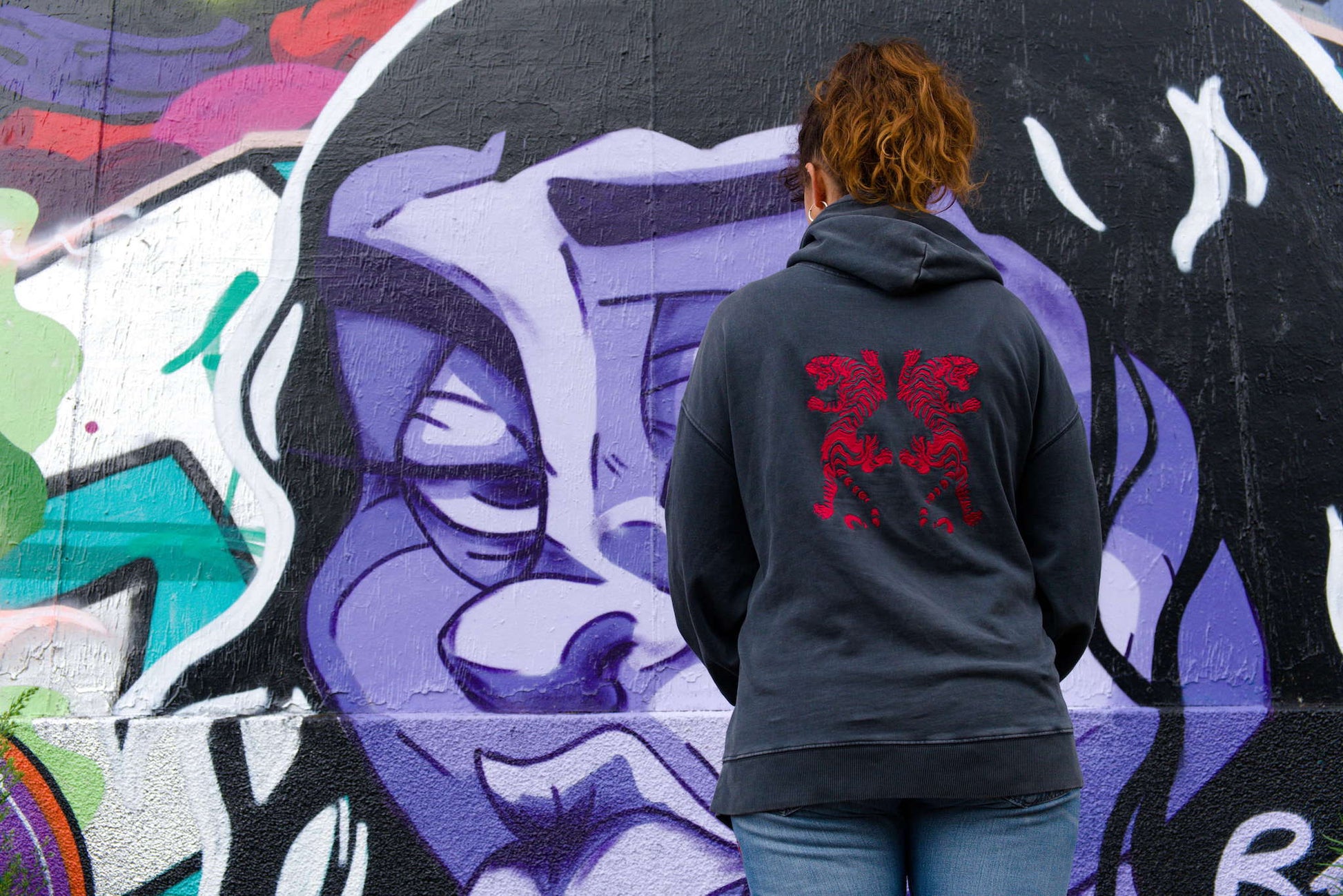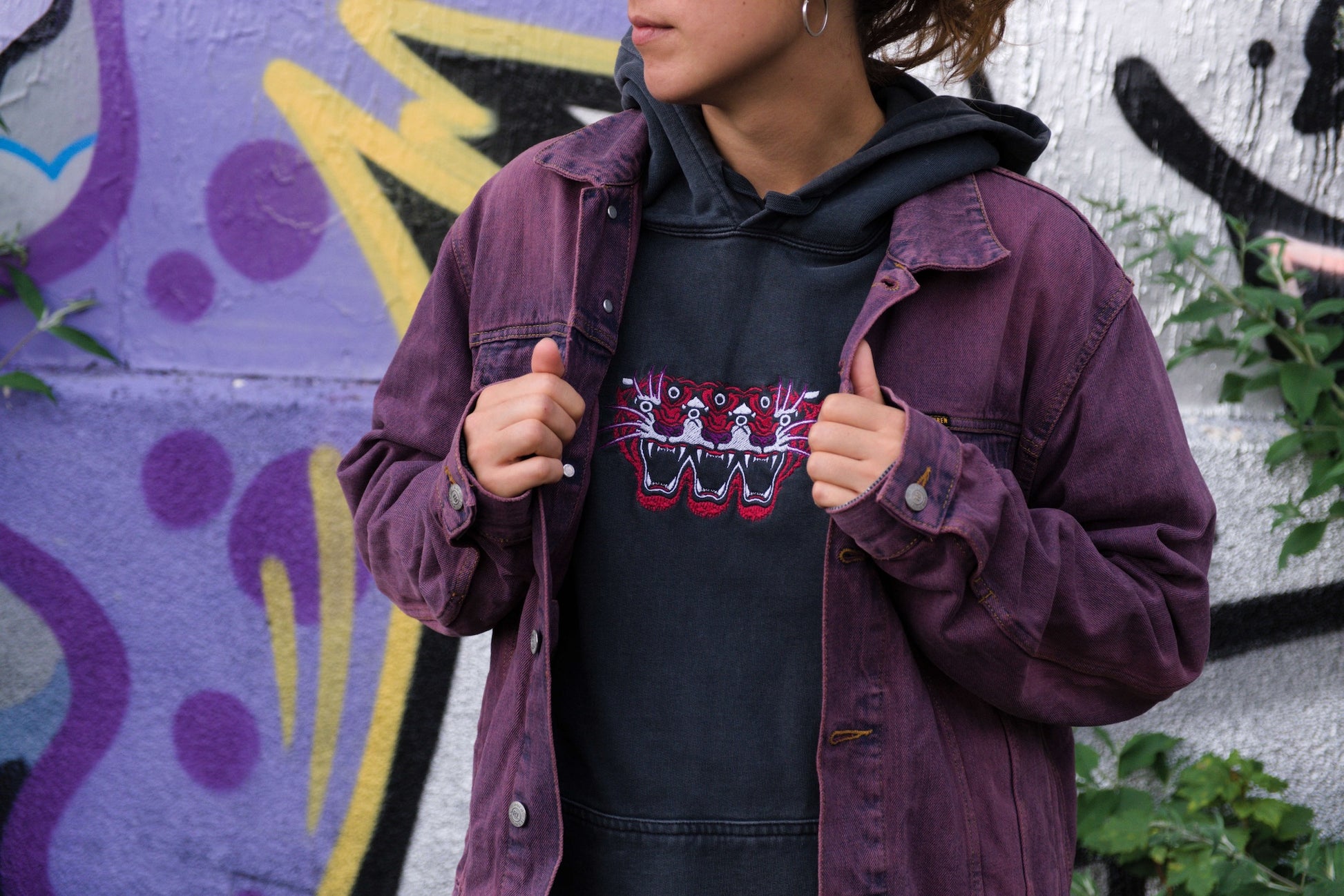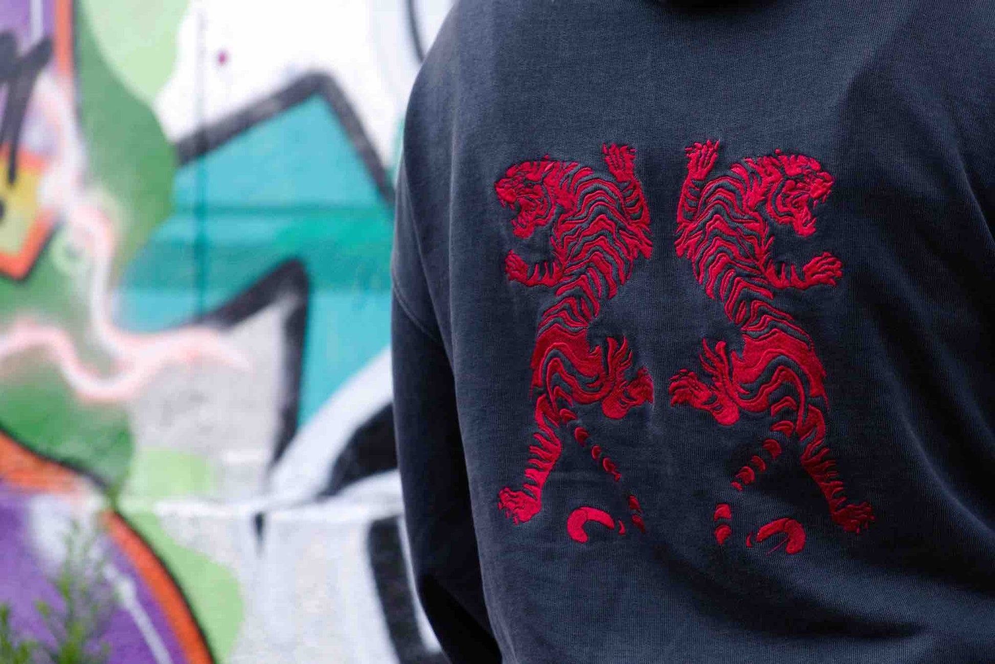 The Three-Eyed Tiger Hoodie is a limited-edition embroidered piece featuring a central design on the front and two stylised Tigers on the back.